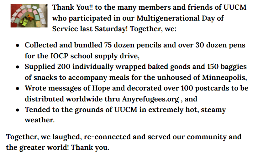 July 30, 2021July 30, 2021 by adminuucm July Day of Service: Thank You! Image Announcements, CYRE Leave a comment Share this: Click to share on Facebook (Opens in new window) Facebook Click to share on X (Opens in new window) X Click to print (Opens in new window) Print Click to email a link to a friend (Opens in new window) Email Like Loading... Related