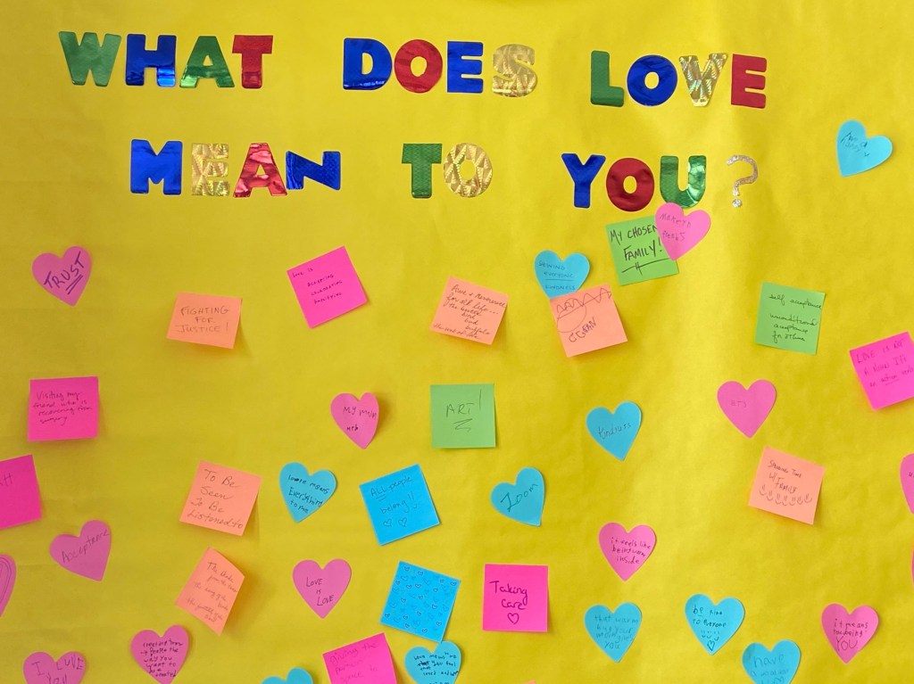 Throughout the month of February, we invited UUCMers of all ages to share what love means to them on our Wall of Love in the Community Room. We put together a collage of the answers we shared.