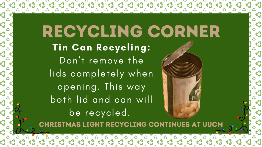 December 14, 2023 by adminuucm Recycling Corner: Tin Can Recycling Image Announcements, Blog, Social Justice Leave a comment Share this: Click to share on Facebook (Opens in new window) Facebook Click to share on X (Opens in new window) X Click to print (Opens in new window) Print Click to email a link to a friend (Opens in new window) Email Like Loading... Related