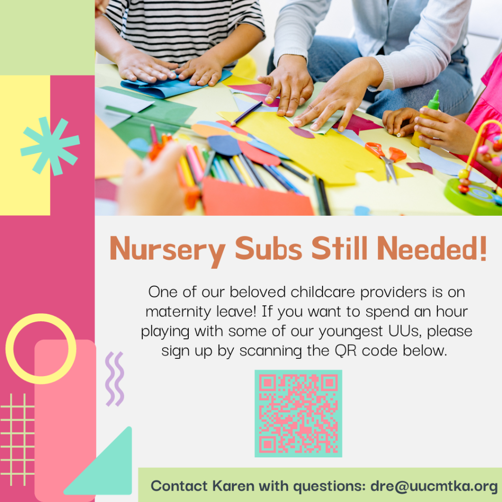 December 20, 2023 by adminuucm UUCM Nursery Subs Image Announcements, Blog, CYRE Leave a comment Share this: Click to share on Facebook (Opens in new window) Facebook Click to share on X (Opens in new window) X Click to print (Opens in new window) Print Click to email a link to a friend (Opens in new window) Email Like Loading... Related