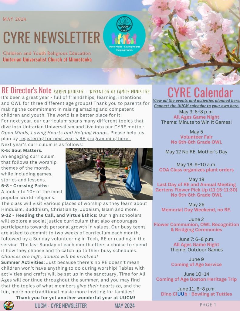 May 7, 2024 by adminuucm CYRE May Newsletter Announcements, Blog, CYRE Leave a comment Please check out our new May CYRE Newsletter! Please email the office to sign up for our mailing list. Share this: Click to share on Facebook (Opens in new window) Facebook Click to share on X (Opens in new window) X Click to print (Opens in new window) Print Click to email a link to a friend (Opens in new window) Email Like Loading... Related