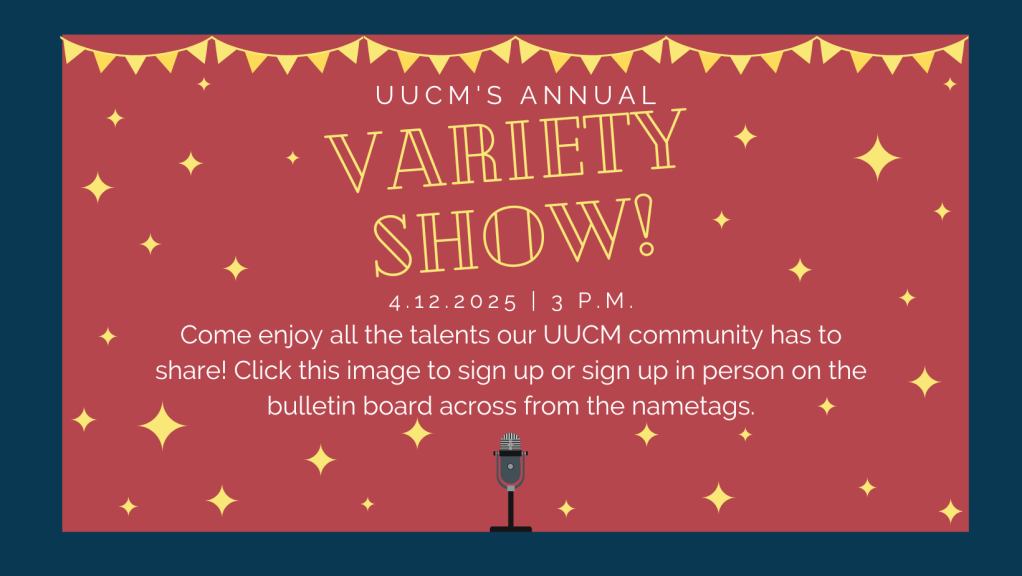 January 12, 2025 by adminuucm Save the Date: UUCM Variety Show! Image Announcements, Blog Leave a comment Share this: Click to share on Facebook (Opens in new window) Facebook Click to share on X (Opens in new window) X Click to print (Opens in new window) Print Click to email a link to a friend (Opens in new window) Email Like Loading... Related