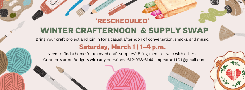 February 6, 2025February 6, 2025 by adminuucm Winter Crafternoon Rescheduled! Announcements, Blog Leave a comment Please don’t worry about driving through the snow on Saturday, join us for Winter Crafternoon on March 1 instead! Share this: Click to share on Facebook (Opens in new window) Facebook Click to share on X (Opens in new window) X Click to print (Opens in new window) Print Click to email a link to a friend (Opens in new window) Email Like Loading... Related