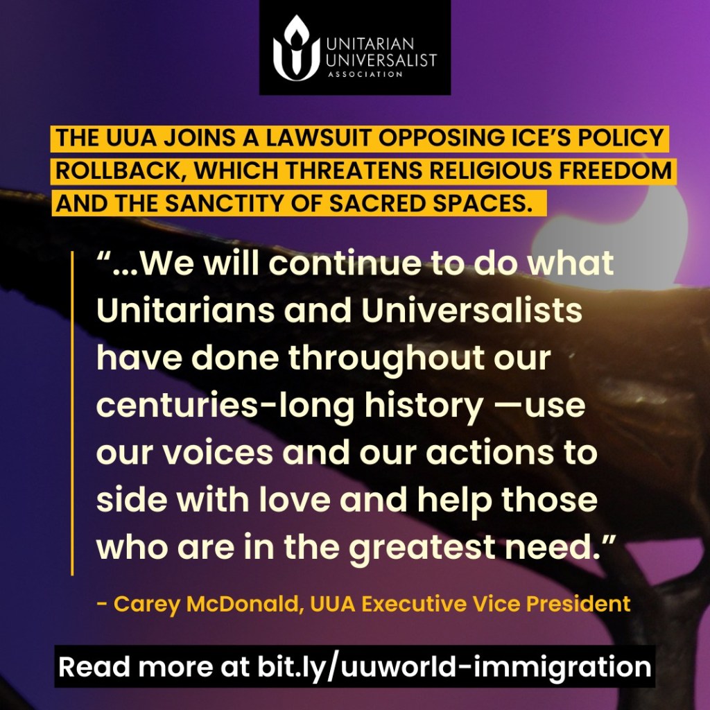 The Unitarian Universalist Association has joined a multifaith coalition representing millions of Americans across dozens of denominations and the Institute for Constitutional Advocacy and Protection in a lawsuit challenging ICE’s “sensitive locations policy.” This action is an expression of our deeply held religious values which call us to communal care and protection of the most vulnerable.This decision directly interferes with our ability to fulfill our religious mandate and serve all of our congregants equally and with the dignity they deserve. The federal government’s extreme actions challenges a foundation of our faith and threatens to shatter our consecrated spaces. Our faith compels us to take action and protect our places of worship. Read more about the lawsuit and other plaintiffs joining us in this action by clicking here.