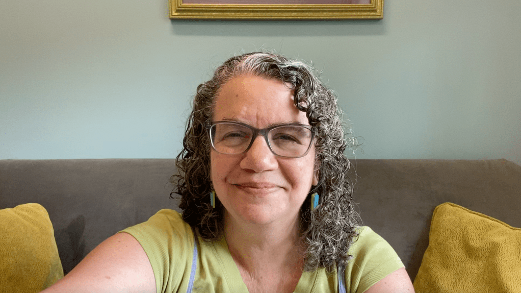 [Visual description: With dark curly hair and blue glasses, Rev. Lisa is wearing a bright green shirt and sitting on a grey couch in front of a pale blue wall.]