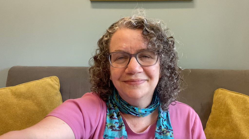 [Visual description: Rev. Lisa has grey/brown curly hair and is wearing glasses, a pink shirt and a blue scarf. She is sitting on a grey couch with yellow pillows in front of a blue wall.]