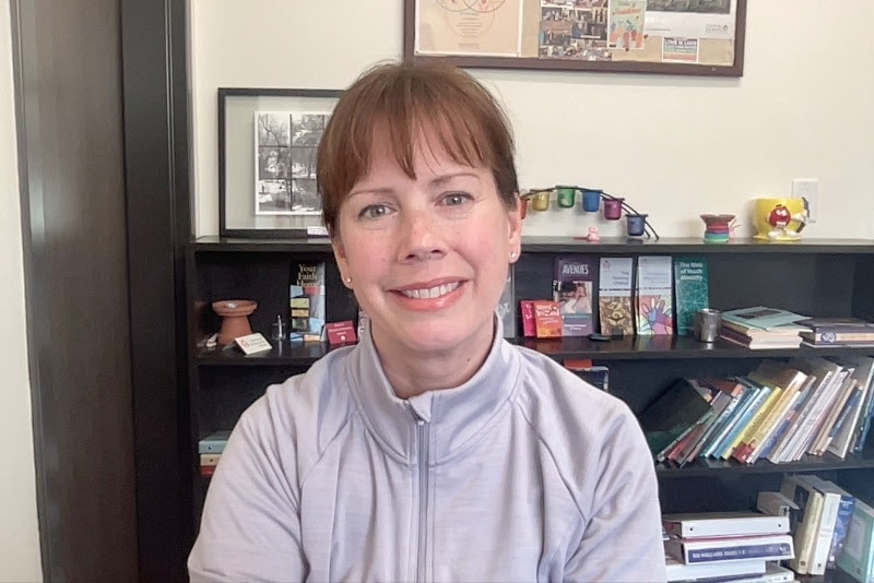 | [Visual description: Meleah is sitting in an office with a desk and office chair behind her. With brown wavy hair, she is wearing brown glasses, a dark blue shirt and light blue scarf.] |