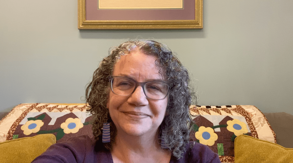 [Visual Description: Rev. Lisa has brown curly hair and is wearing blue glasses and a purple top. She is sitting on a grey couch with a multi-colored quilt and blue wall behind her.]