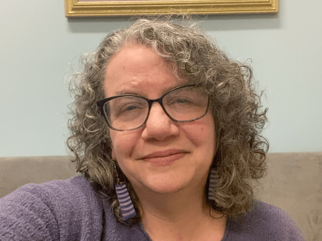 Visual Description: Rev. Lisa is wearing a purple sweater and blue glasses and is seated on a grey couch in front of a blue wall.